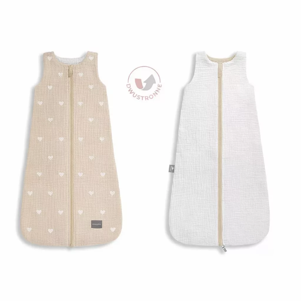 Sleepee kifordítható muszlin baba hálózsák 4-24 hó (M méret), beige homok szín, fehér szívecskés mintával (1.0 TOG)