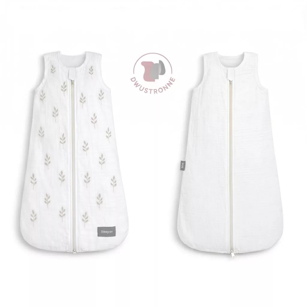 Sleepee újszülött kifordítható muszlin baba hálózsák 0-4 hó (S méret),  fehér színű, barnás levél mintával (1.0 TOG)
