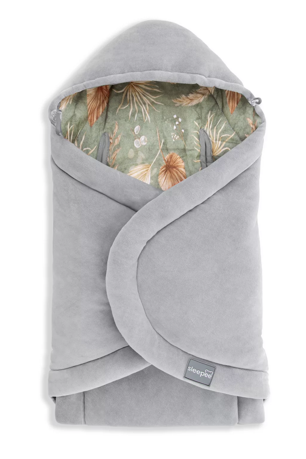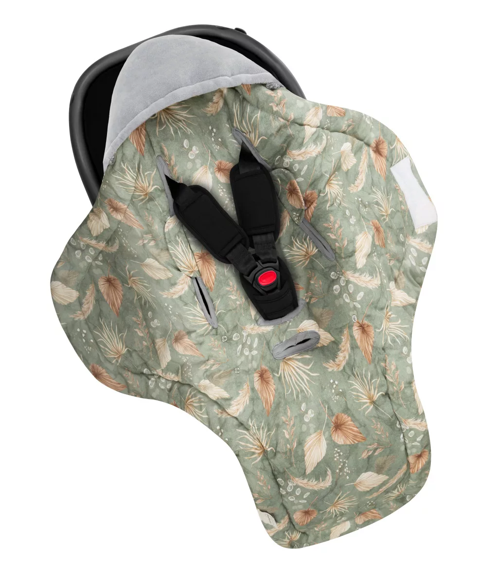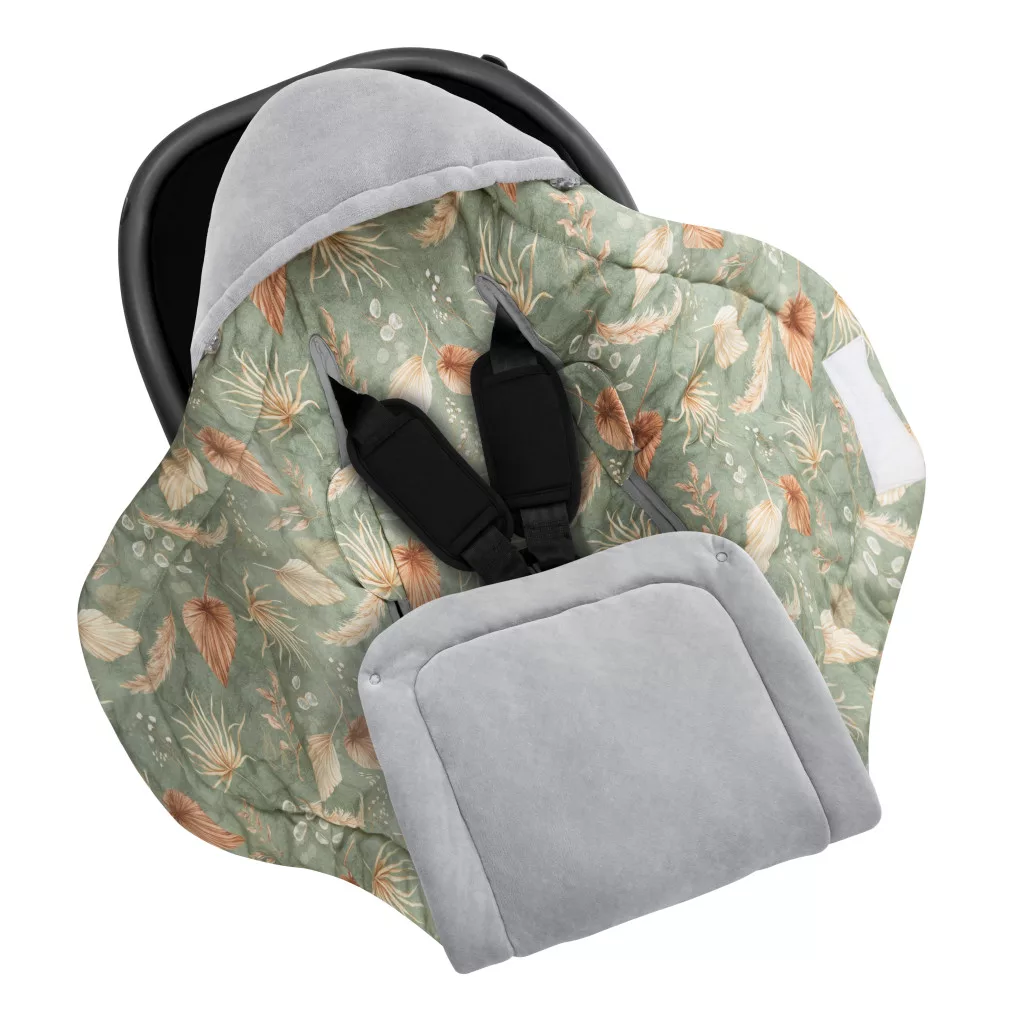 Sleepee Bohemian Grey plüss babatakaró-pólya autósülésbe, szürke-zöld tollas mintájú meleg hordozóba illeszthető kivitel biztonsági öv nyílásokkal