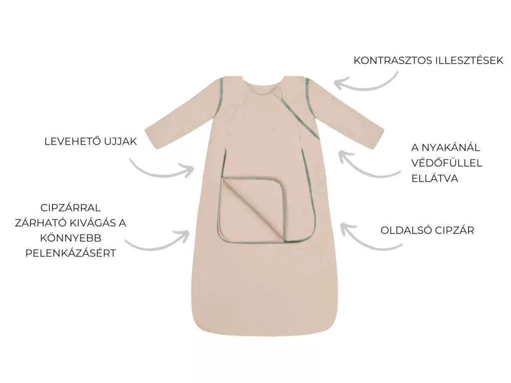 Levehető ujjakkal rendelkezik, így sokoldalú alvótárs bármilyen hőmérséklet esetén. Ha hűvösebb van, az ujjakat rajta hagyhatod, hogy a babát teljesen betakarja. Melegebb éjszakákon egyszerűen csak gombold ki az ujját, és alakítsd át a hálózsákot kényelmes, ujjatlan változattá. A hálózsák mindig az aktuális igényeitekhez igazodik és szinte egész évben használható.