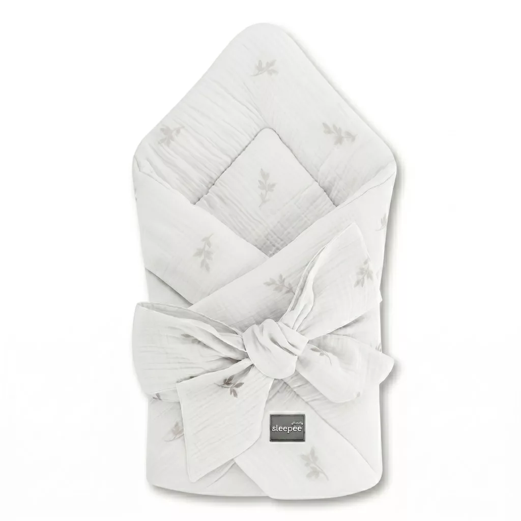 Sleepee újszülött baba pólya, légáteresztő pamut muszlin anyagból, fehér színű, barnás, levél mintával