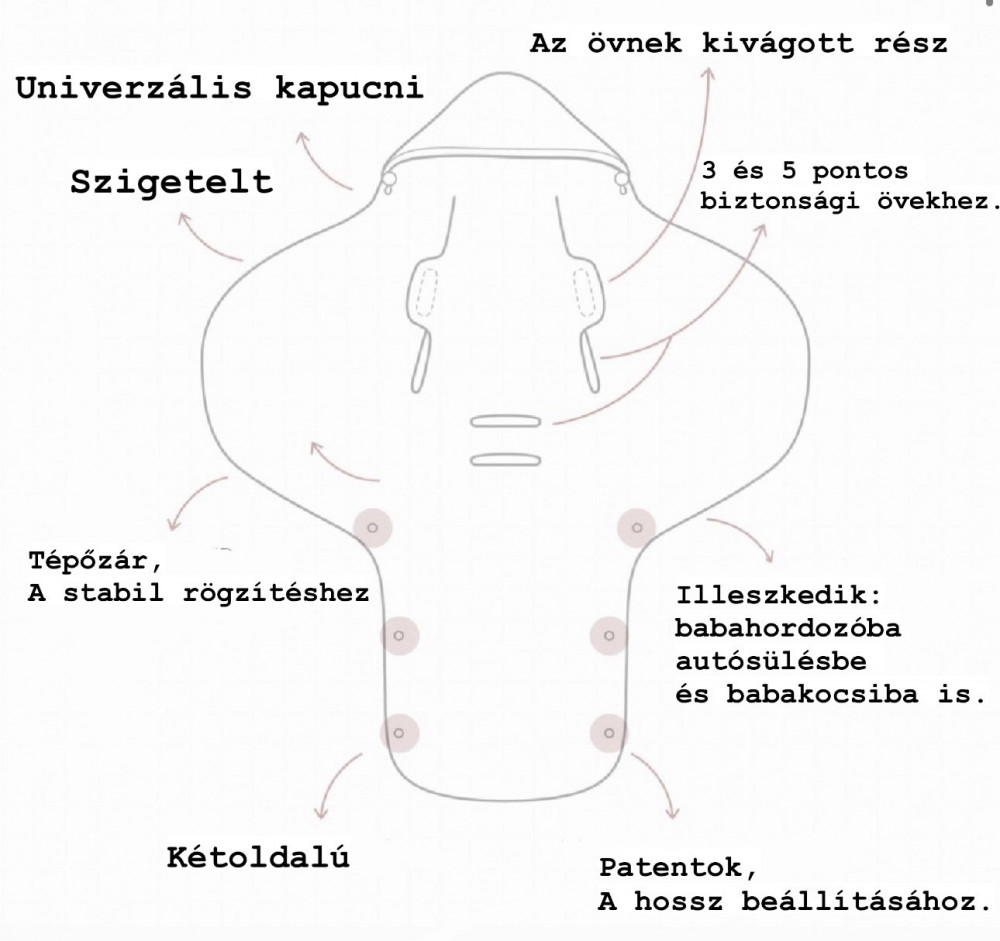 Prémium termékünkön kapucni található, ami méretre igazítható, illetve további különlegessége, hogy az alsó részt a lábnál fel lehet patentolni, majd tépőzárral rögzíteni, így stabilan illeszkedik a babára.