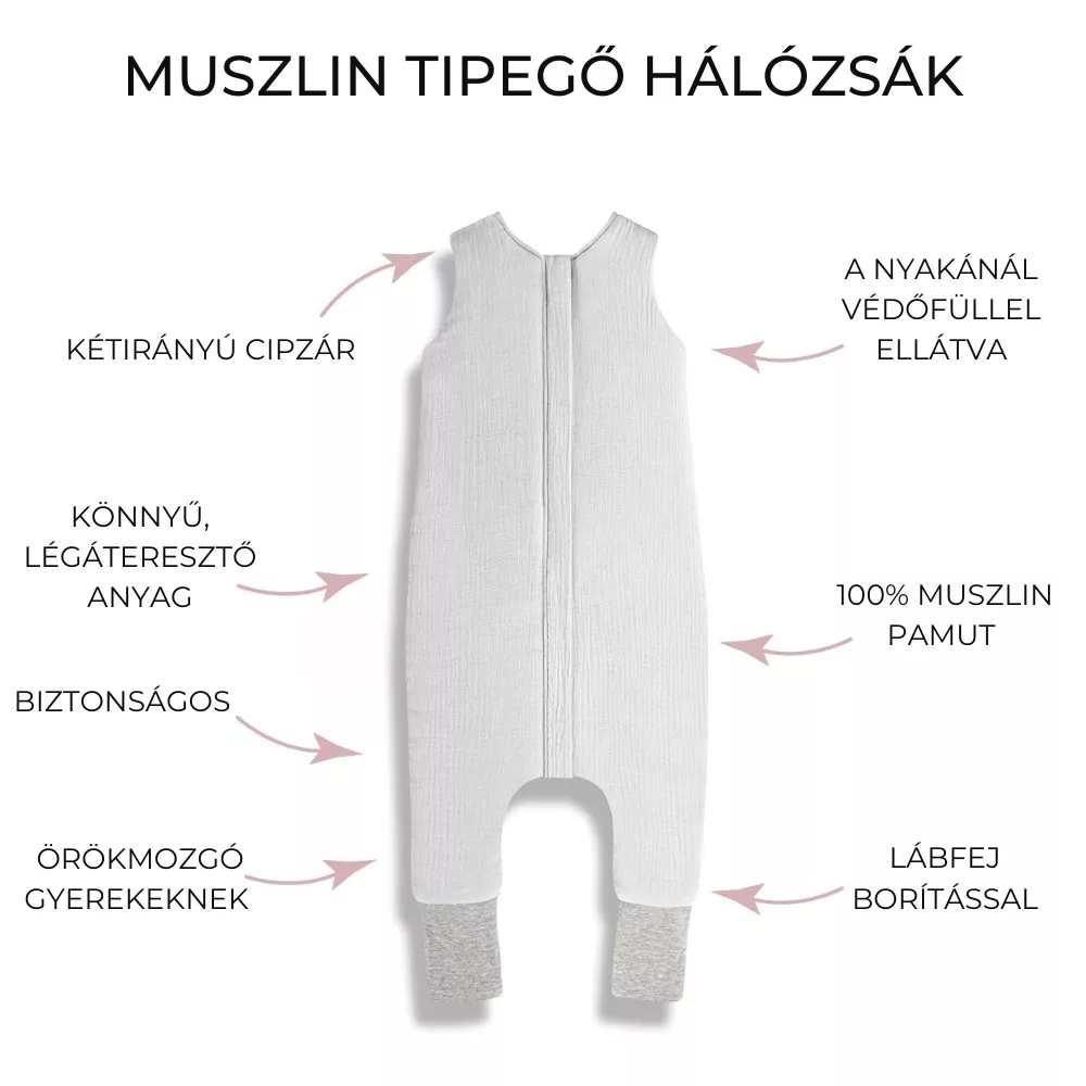 Muszlin hálózsákjaink ideálisak a forró és meleg napokon való alváshoz. Rendkívül finom muszlin anyagból készültek, amely lehetővé teszi a baba bőrének lélegzését. A pamut muszlin egy teljesen természetes anyag, amely légáteresztő képességet biztosít. Ennek köszönhetően a bőr lélegzik, ami viszont megakadályozza a túlmelegedést és az izzadást.